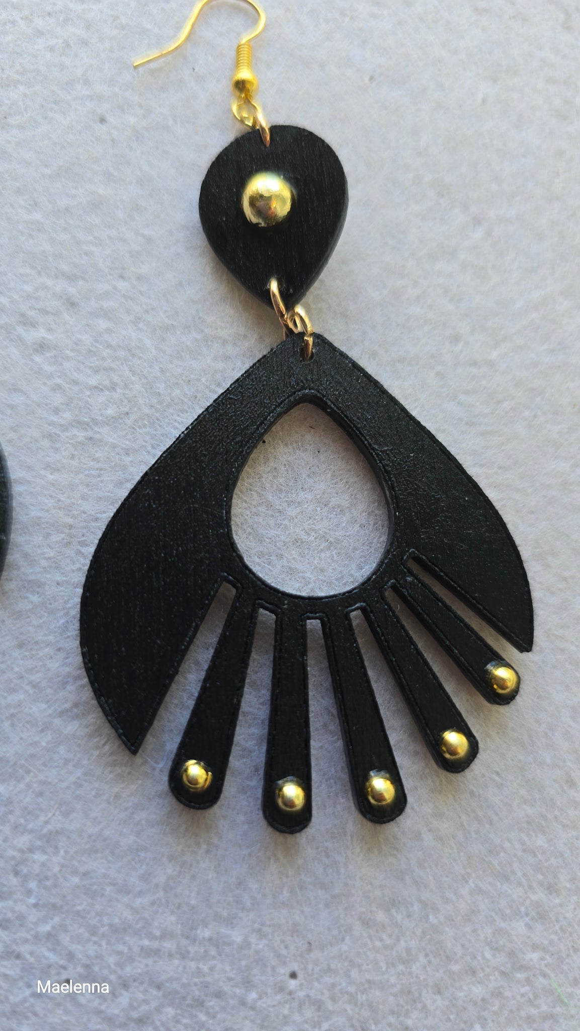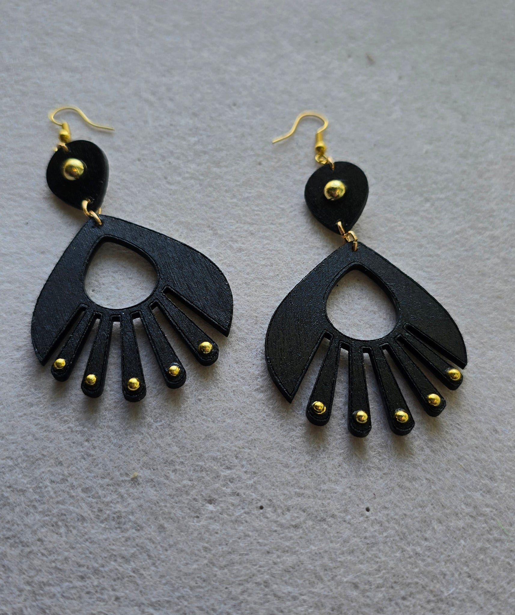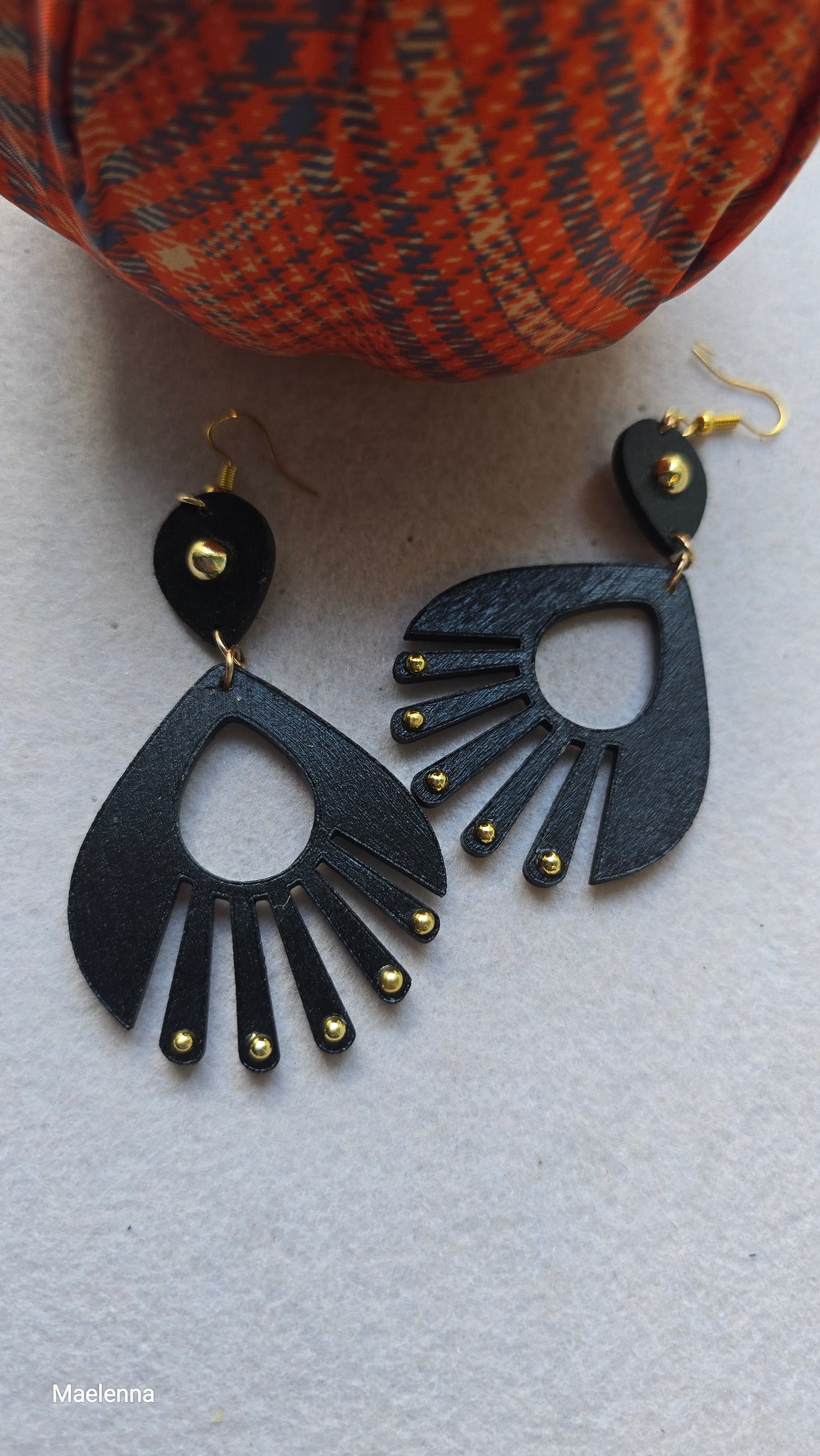 Ebony Moon is quiet elegance that walks beside you, whispering strength. Its silhouette evokes rising drops from the earth, while the golden accents—tiny plastic pearls—gently catch the light like little suns.