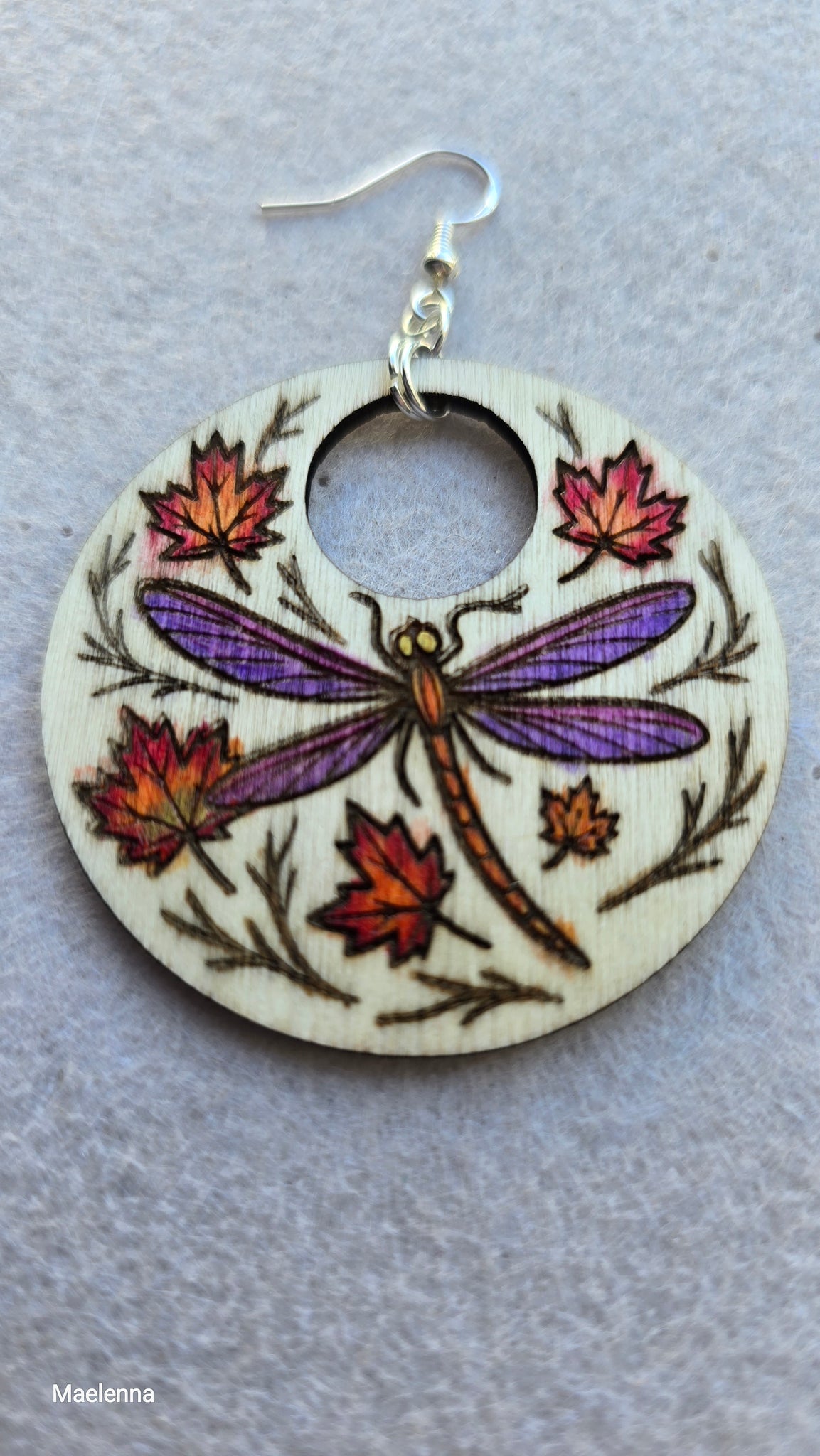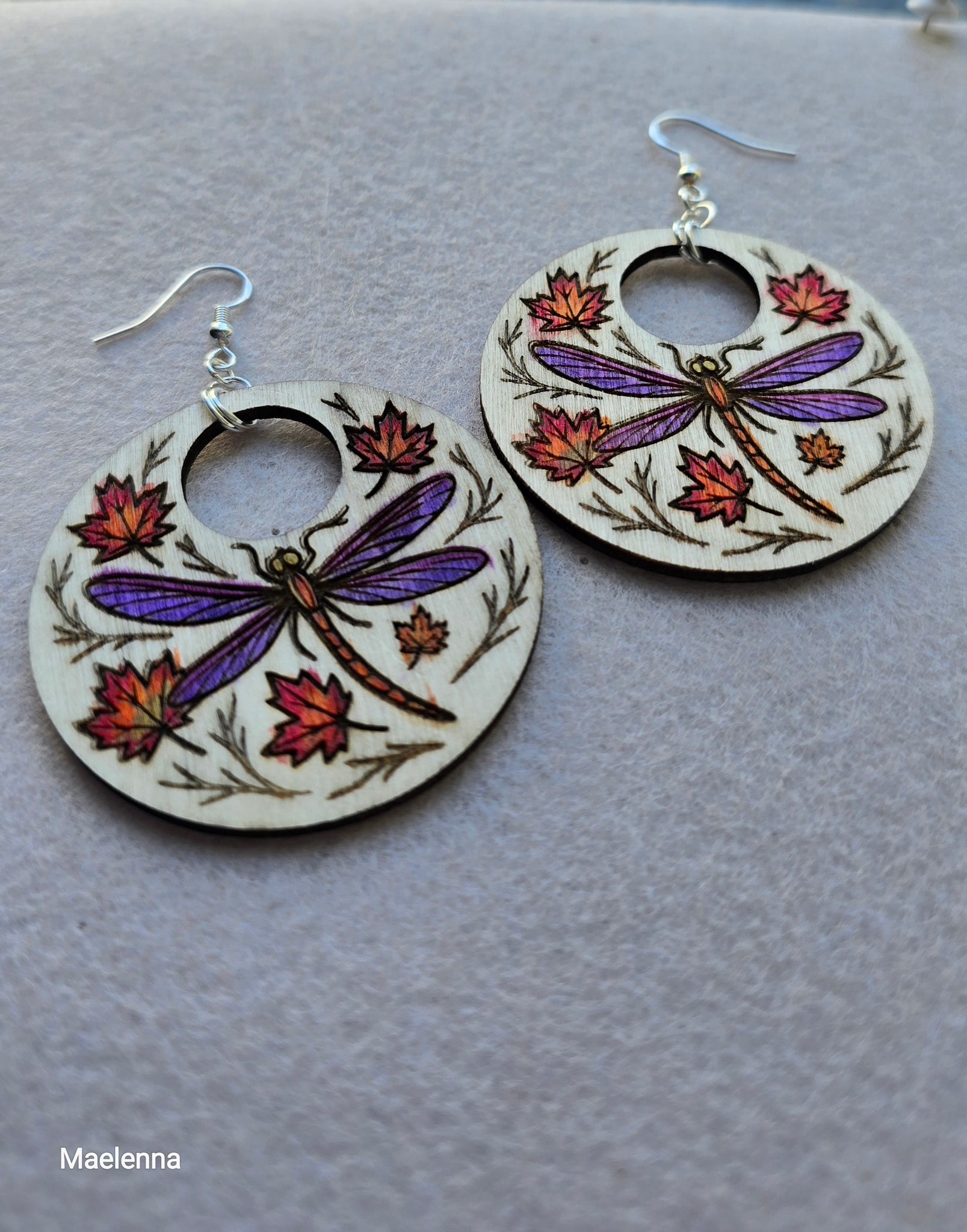 Circular earrings made of raw wood, hand-painted with dragonflies and  maples leaves.